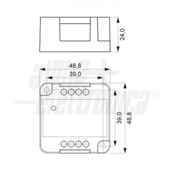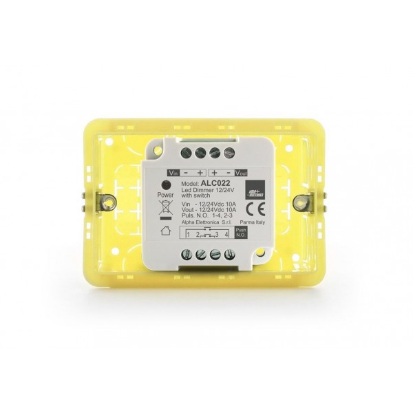 Dimmer monocolore per strisce led e sorgenti led resistive a tensione costante 12V oppure 24V. Il controllo dell’intensità luminosa viene eseguito tramite pulsante generico opportunamente installato ai morsetti PP. Pulsante non fornito.