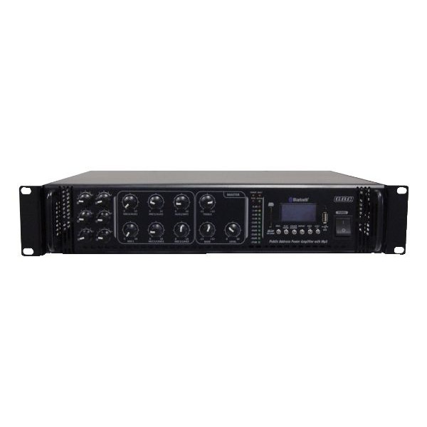 Amplificatore integrato di potenza adatto per le applicazioni Public Address più diversificate e impegnative. Terminali a vite per output 6 zone con controlli separati. Lettore MP3. Radio FM SCAN con memorizzazione scansione. BLUETOOTH. Raffreddamento a ventola. 5 ingressi Mic. 3 ingressi Aux. 2 ingressi Line. 1 uscita PRE-AMP. Uscita PA a 70V / 100V. Uscita 4-16 Ohm per la connessione di un sistema di altoparlanti passivo per il monitor. Connessione Mic sul pannello frontale con funzione di priorità. Dimensioni (LxAxP): 435 x 97 x 415 mm. - Doppia alimentazione 230Vca / 24Vcc.