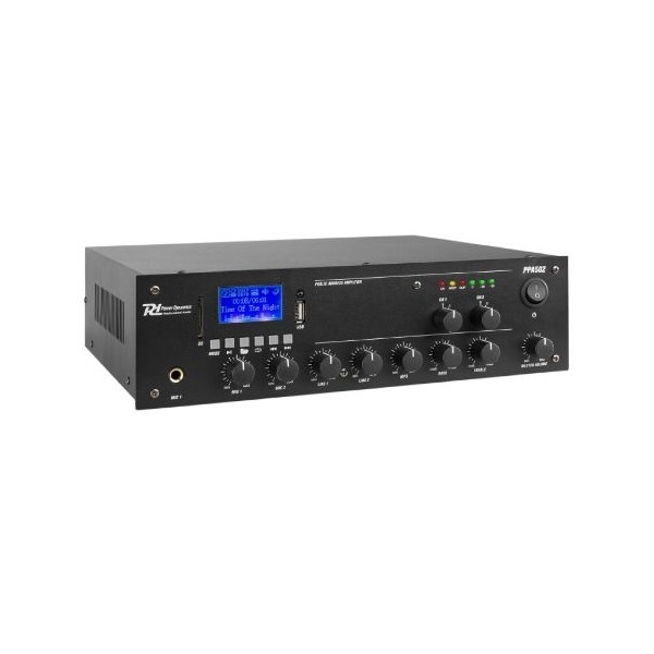 Amplificatore PA 50W con uscite 4/8 ohm e 70V e 100V caratterizzato da un estrema facilità di utilizzo, ottime prestazioni ed affidabilità ed è quindi particolarmente adatto per una vasta gamma di installazioni di piccole e medie dimensioni. Questa gamma amplificatori è dotata di un lettore multimediale (porte USB / SD e BT) per la riproduzione di file MP3. E 'inoltre dotato di equalizzatore (sul lettore mp3), 2 ingressi microfonici/line , un ingresso ausiliario, ingresso Tel, uscita line, controllo toni alti/bassi e volume master. Possibilità di aliumentazione esterna a 12V. Risulta perfetto per ambienti commerciali che richiedono il controllo completo su 2 diferse aree / stanze. Provvisto di telecomando IR.