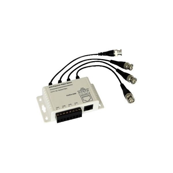 Unità passiva a 4 canali, in grado di trasmettere su cavo CAT.5, senza perdite o interferenze e su lunghe distanze (cablaggi oltre 300m. e fino a 1.500m in caso di utilizzo ricevitori video amplificati), i segnali video destinati alla videosorveglianza (Telecamere TVCC, Monitor, TV, DVR, Multiplexer). L'unità è composta da 4 cavetti intestati con spine BNC e sulla dorsale di morsettiera a 8 vie con fissaggio a viti per il collegamento del cavo rete mutipolare UTP (CAT.5 o superiori) e di una presa RJ45 nel caso in cui si voglia utilizzare un cavo UTP già intestato con connettore 8 poli.
