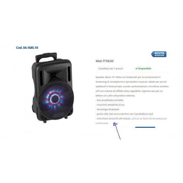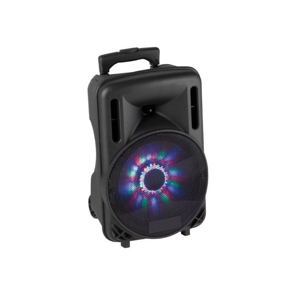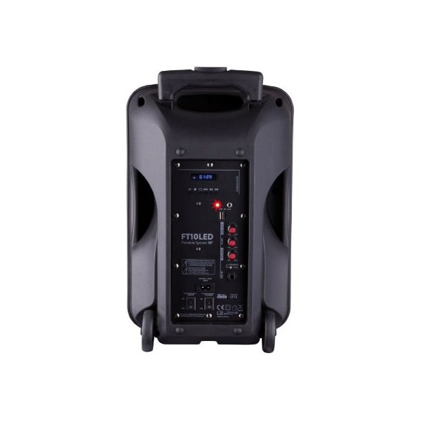 Speaker attivo 10" 450W con Bluetooth per la connessione in streaming di Smartphone e riproduttori musicali. Ideale per piccoli spettacoli e feste private, scuole o presentazioni. Microfono wireless UHF con volume ed effetto echo regolabile. Ingresso aux per un lettore CD o altro dispositivo esterno.