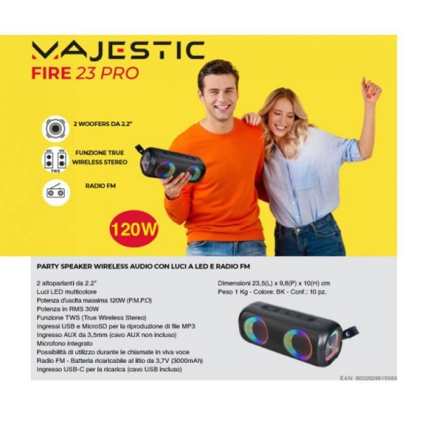 l Majestic FIRE 23 PRO BK è lo speaker portatile pensato per chi vuole portare musica ed energia ovunque. Grazie alla connessione Wireless Audio e ai due altoparlanti da 2.2”, offre un suono potente e nitido, valorizzato dai 15W RMS per canale e dalla tecnologia TWS, che permette di abbinarne due per un’esperienza stereo completa. Le luci LED multicolore creano l’atmosfera perfetta per ogni momento, dalle feste in casa alle serate all’aperto.