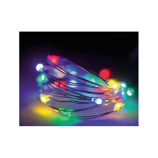 Catena microled adatta a decorazioni di piccoli alberi di Natale o a creare punti luce per vasi, tavoli, ecc.. A luce fissa. Con timer 6h. A batteria. Durata delle batterie 48h circa. Uso interno.
