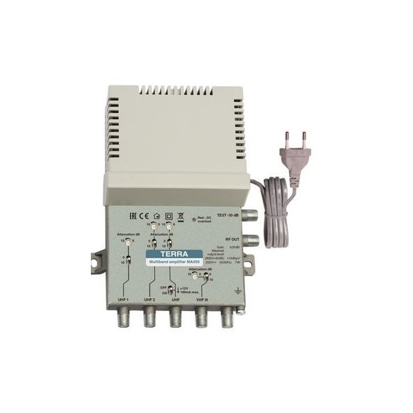 Amplificatori multibanda da interno, serie pressofusione, MEDIA POTENZA, LTE ready, 20/30dB selezionabile multibanda 4 in,taglio lte guadagno 20/30db Amplificatori a bande separate per combinare e bilanciare i segnali di 2, 3 o 4 antenne. Taglio UHF 790MHz, guadagno medio 30dB Switch 0-10dB per far lavorare l’amplificatore con guadagno 20 o 30dB su ogni ingresso Attenuatori 0-20dB regolabili su ciascun ingresso; alimentazione in continua per preampli attivabile con switch Nuovo case in pressofusione compatto; Protezione e indicazione dei sovraccarichi in continua Livello di uscita: 115dBuV (IMD3=60dB DIN45004B); 112dBuV (IMD3=60dB) Codice Descrizione