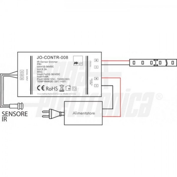 Interruttore dimmerabile con sensore infrarosso IR attraverso il quale è possibile controllare l'accensione automatica e la regolazione di intensità di nastri led, lampade e faretti funzionanti a tensione costante (12, 24 oppure 36Vdc).