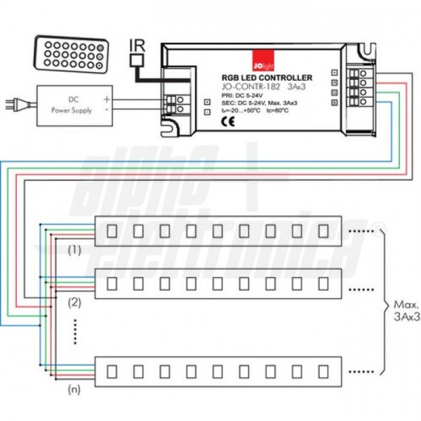 L'apposito telecomando IR consente il controllo dell'intensità luminosa, dei modi di funzionamento oltre che il controllo on/off delle sorgenti led collegate. Con la centralina è possibile realizzare effetti di illuminazione statici oppure dinamici impostando i modi di funzionamento prestabiliti.