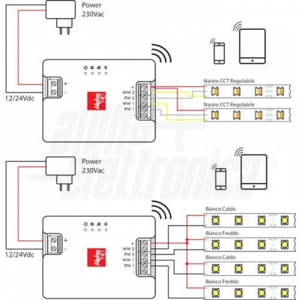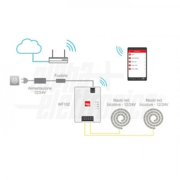 Il WF102 Alpha NET è il nuovo controller Wifi sviluppato da Alpha Elettronica per il controllo di nastri bicolore a CCT regolabile funzionanti a 12/24V.