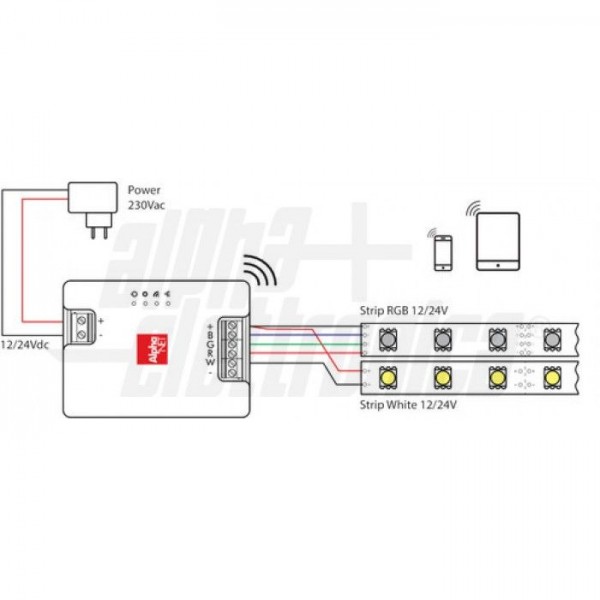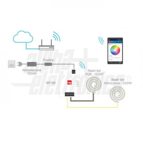 Il WF100 Alpha NET è il nuovo controller Wifi sviluppato da Alpha Elettronica per il controllo di nastri led colorati (RGB) e bianchi (W) funzionanti a 12/24V.