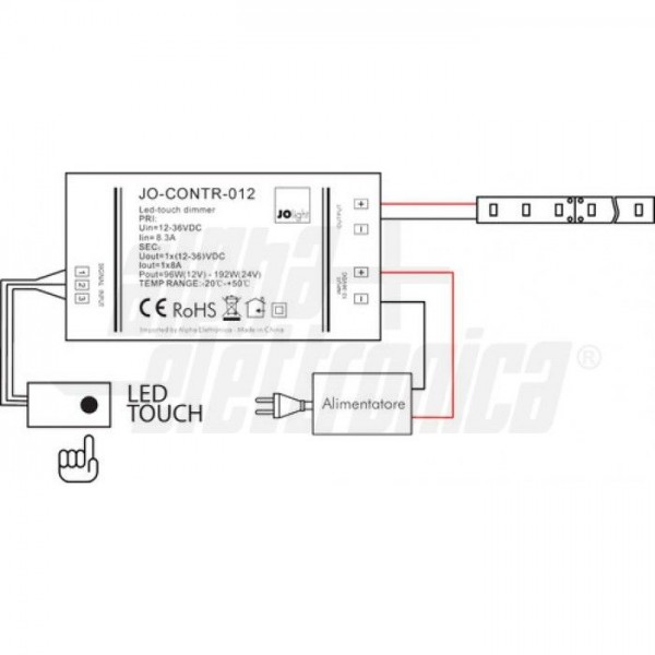 Tenendo il dito sul sensore la luminosità continuerà a variare l'intensità ciclicamente con una durata di 18-20 secondi. Togliendo il dito il ciclo si arresta. Il controller mantiene la memoria dell'intensità selezionata anche dopo lo spegnimento dell'alimentazione.