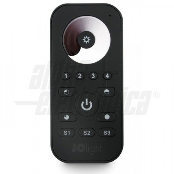 Il telecomando JO-CONTR-025, utilizzato con il ricevitore JO-CONTR-241 oppure JO-CONTR-241DIN (non incluso) consente di regolare contemporaneamente l’intensità luminosa di nastri led collegati alle uscite del ricevitore. L’intensità può essere modificata tramite rotella touch e tramite i tasti funzione.