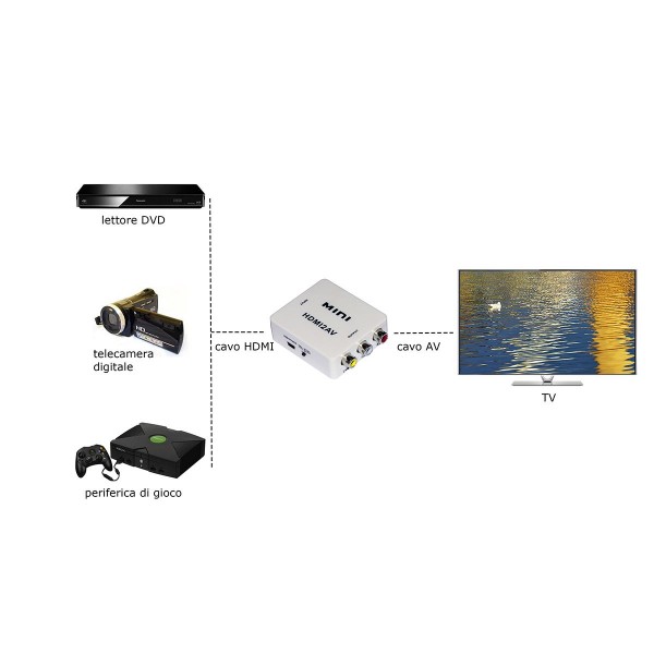 Questo adattatore permette la conversione di un segnale audio-video HDMI in segnale video composito AV (CVBS) + segnale audio stereo L/R, con supporto anche del segnale DVI. Si può quindi collegare un lettore DVD, una telecamera digitale ecc. HDMI a un video, monitor o TV analogico coi connettori RCA (CVBS, L, R). Converte il segnale di alta qualità HDMI nel normale segnaleCVBS(con definizione standard 480i, 576i). In questo modo si può riprodurre su TV, VHS, VCR, DVD ecc. Supporta i due formati NTSC e PAL.