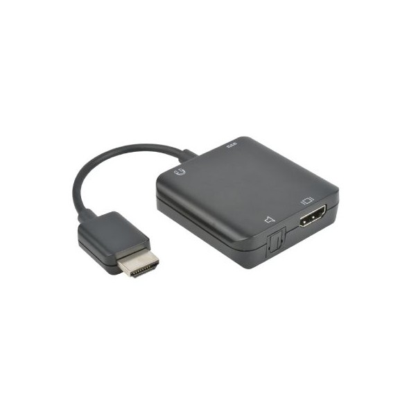Questo piccolo estrattore audio consente di separare i segnali audio analogici e digitali da una sorgente HDMI 4K 60Hz. L'audio potrà poi essere inviato a un sistema Stereo amplificato o a un impianto Home Cinema 2.0 o 5.1. Consente perciò di fruire di un audio di alto livello anche sui moderni TV HD a volte deludenti per gli appassionati di Hi-Fi. Dispone di una uscita audio digitale SPDIF TosLink e di un'uscita audio analogica 3,5mm Stereo per cuffie (N.B.: uscita NON amplificata) utilizzabili contemporaneamente. L'uscita SPDIF supporta un eventuale convertitore D/A o da TosLink a Coax in cascata. Supporta impianti 2.0 e 5.1 canali (a condizione che la sorgente li supporti). Supporta 4Kx2K @ 60Hz con ampiezza di banda 18Gbps. Supporta DTS e Dolby Digital. Ingresso micro USB per alimentazione supplementare (opzionale). Dimensioni 55x55x16mm, peso 55g.