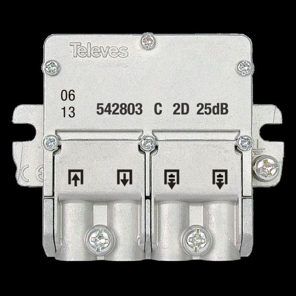 Derivatore mini da 2 derivazioni con sistema di connessione EasyF, per segnali SMATV. Con la sua perdita di derivazione (25dB), si raccomanda la sua installazione ai piani 7 a 12 (tipo C).