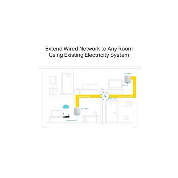 Estendi la rete LAN domestica o aziendale utilizzando i normali cavi elettrici già esistenti per il trasferimento dati. Non sono richiesti cavi addizionali: è sufficiente collegare TL-PA411 ad una presa a muro per trasformare l'impianto elettrico in una rete. Grazie all`elevatissima velocità di trasferimento fino a 500Mbps è possibile godere di video streaming HD, online gaming, VoIP ed ogni altra applicazione molto esigente in termini di banda. Design estremamente compatto: TL-PA411 è molto più piccolo della maggior parte degli altri prodotti Powerline (solo 30mm di spessore). Copertura fino a 300 metri. TL-PA411 è la scelta ideale per connettere tutti i dispositivi di rete, da computer e console di gioco, a set-top box per IPTV, stampanti e NAS. È dotato di un sofisticato sistema di risparmio energetico e consuma meno energia rispetto ai preesistenti adattatori Powerline. In assenza di trasmissione o ricezione dati l'adattatore passa automaticamente alla modalità di risparmio energetico, riducendo l'assorbimento di energia fino all'85%.