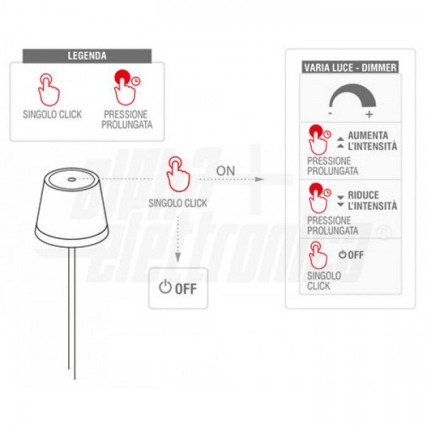 Intensità luminosa regolabile (0-100%) tramite pulsante touch. Incluso cavo USB da tipo C a tipo A per collegamento al caricabatteria.