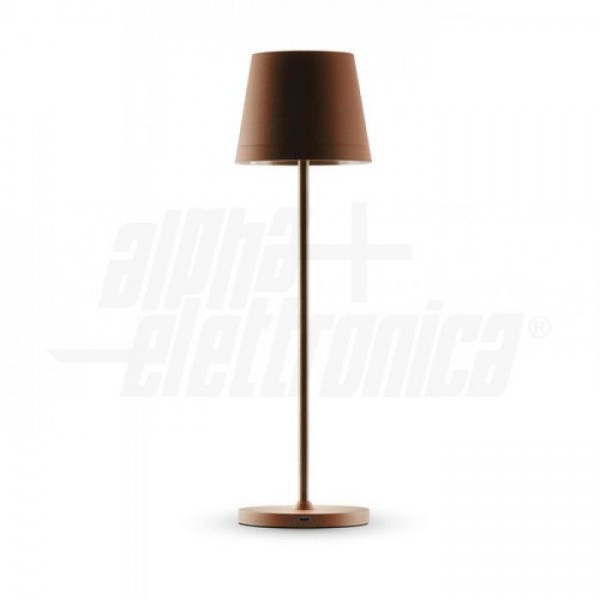 Lampada da tavolo a LED a batteria. Interruttore Touch illuminato nella parte superiore. Emissione di luce calda verso il basso. La lampada integra una batteria agli ioni di litio per una durata della carica maggiore. Disponibile in versione bianca, nera, corten e verde.