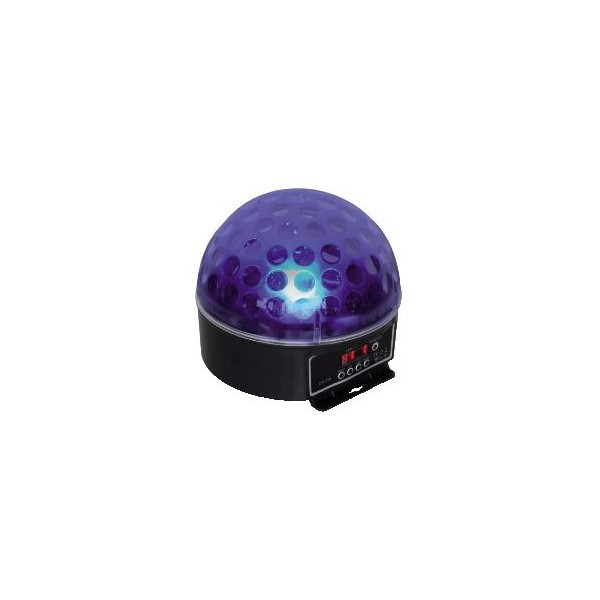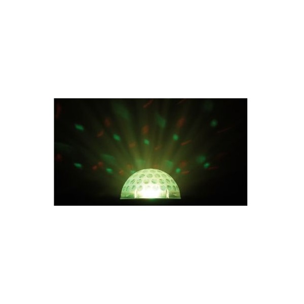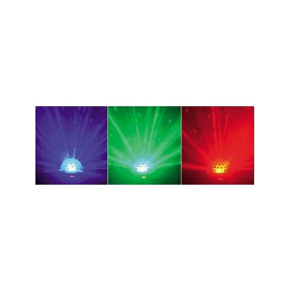 Ricrea l’effetto di una sfera a specchi ultra-luminosa, con gli effetti supplementari generati dalla scocca translucida. 82 fasci luminosi di grande potenza anche su lunghe distanze, emessi da 6 LED RGB (LED ultrabright, 18W di potenza totali); luminosità e effetto strobo regolabili; rotante a 360°, controllabile via DMX (DMX 512 6 canali, con DMX in e out); modalità auto stand alone e sound controlled (con microfono incorporato). Dimensioni 175 x 175 x 160mm.