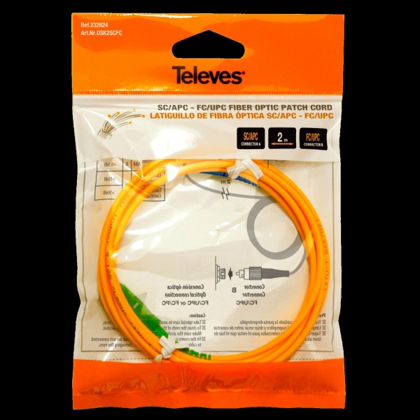 Single-mode (SM) optical fibre patch cord, Pre-terminated on one end with an SC/APC connector and with an FC/UPC connector on the other; it can thus be used as an adapter for devices with different connectorization. The sheath being LSFH, it is recommended for indoor use.