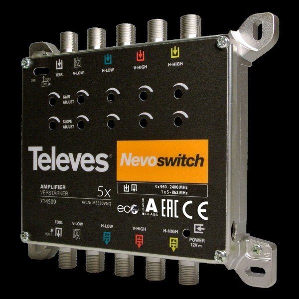 Amplificatore NevoSwitch da 5 ingressi (uno terrestre e gli altri quattro per le polarità satellite ) che permette di aumentare il numero degli utenti dell'impianto ottimizzando il segnale di ognuno. Amplificazione di circa 27dB in terrestre e 31dB in satellite.
