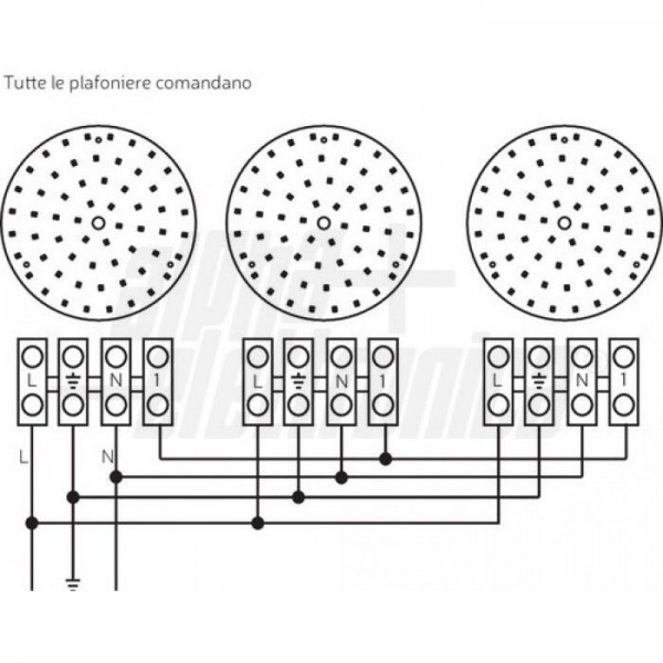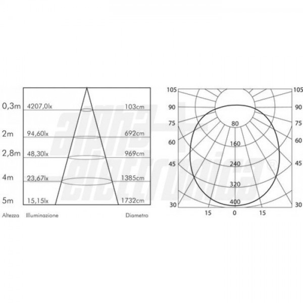 Emissione diffusa. Base bianca in materiale plastico e diffusore in policarbonato opale con montaggio a scatto.