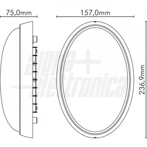 Plafoniera led ovale in alluminio adatta per montaggio a parete o soffitto in ambienti interni o esterni.