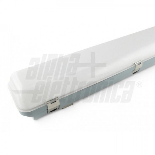 Emissione diffusa. Corpo in ABS grigio e diffusore in polocarbonato opale. Scrocchi a scomparsa in acciaio. Passacavo stagno incluso, corpo non forato. Staffe di fissaggio in acciaio incluse.