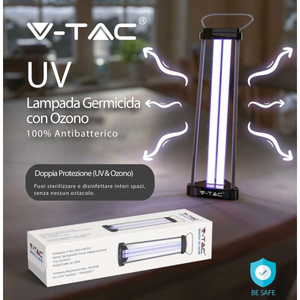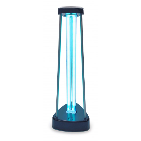 Lampada Germicida da 38W formata da due tubi (sostituibili) che garantiscono una durata superiore alle 6000 ore ed a una copertura d’azione di 60m². La funzione della lampada dura 30 minuti ed è facilmente trasportabile. La radiazione ultravioletta germicida è la radiazione ultravioletta che è caratterizzata da una banda di lunghezze d'onda tale da distruggere batteri, virus e altri microorganismi, modificandone il DNA o l'RNA e quindi inattivandoli e impedendone la riproduzione. Questo principio permette la disinfezione dell'acqua e dell'aria.