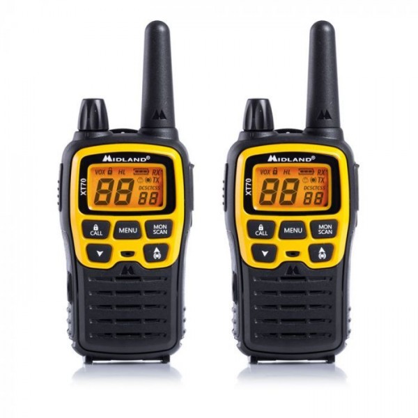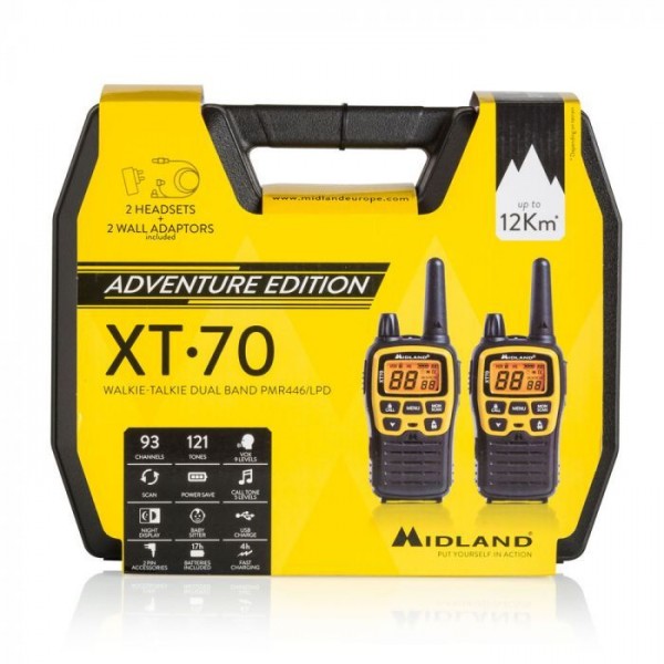 La libertà delle frequenze LPD e la potenza delle PMR446 sono raccontate dal walkie-talkie Midland XT70, un sistema di comunicazione pratico, semplice da usare ma contemporaneamente performante oltre gli standard dei normali walkie-talkie amatoriali. Perché amerai XT70? Per prima cosa perché ti mette a disposizione ben 69 canali LPD e 24 canali PMR446, per comunicare in tutta libertà, senza licenza, su diverse bande e frequenze, così da non restare mai senza copertura nel raggio di 12 km! Se poi vogliamo analizzare i plus che la rendono comoda come nessun’altra radio di questa gamma abbiamo i 38 toni CTCSS (più 83 DCS),  la ricarica via USB, la funzione Baby Sitter e l'Out of Range. Qualche meraviglia in più? I 3 livelli di sensibilità della funzione VOX, la funzione CALL in 5 toni e le 18 ore di autonomia che ti regala il pacco batteria in dotazione. Pronto a comunicare in libertà e potenza?
