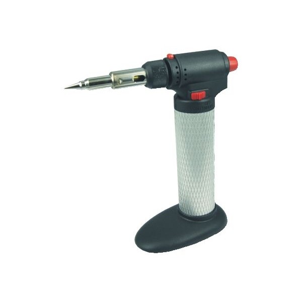 Pistola saldante multifunzione a gas ricaricabile ad accensione piezo elettrica. Configurabile per 3 funzioni: fiamma viva, saldatore, aria calda. Non necessita dialimentazione a rete o a batterie, infatti utilizza gas butano in bomboletta.Si ricarica in pochi secondi come un normale accendino. Ideale per la cucina, l’elettronica,il bricolage. Temperatura saldatore a stagno regolabile tra 210 e 410°C. Temperaturaaria calda circa 450°C. Temperatura fiamma libera circa 1300°C. Fornita disupporto da tavolo. Capacità serbatoio 40ml. Autonomia max 75 min.
