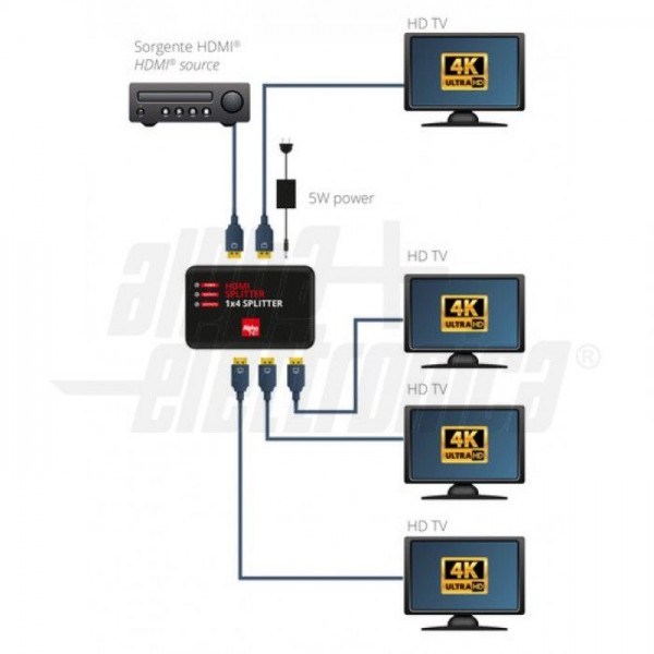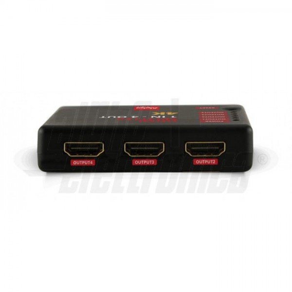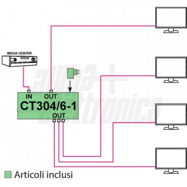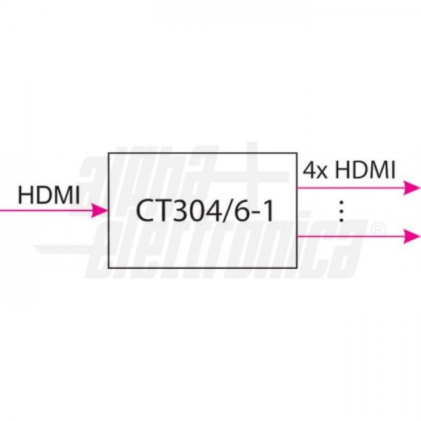 Il distributore di segnale CT304/6-1 suddivide l’ingresso HDMI in 4 uscite per inviare il segnale sorgente in ingresso ad altrettante uscite. Tutte le quattro uscite sono amplificate ed equalizzate per ottenere le migliori prestazioni.