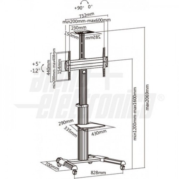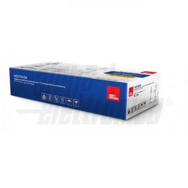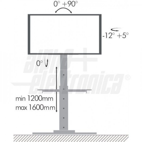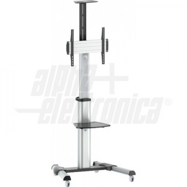 Regolazione in altezza della TV. Inclinazione TV regolabile. Possibilità di ruotare (Pivot) la TV in verticale. Mensola in plastica da 6mm per appoggio dispositivi audio-video. Dimensioni piano di appoggio: 430/290mm x 335mm. Ulteriore mensola superiore per il supporto di una videocamera. Dimensioni piano di appoggio: 285/230mm x 150mm.