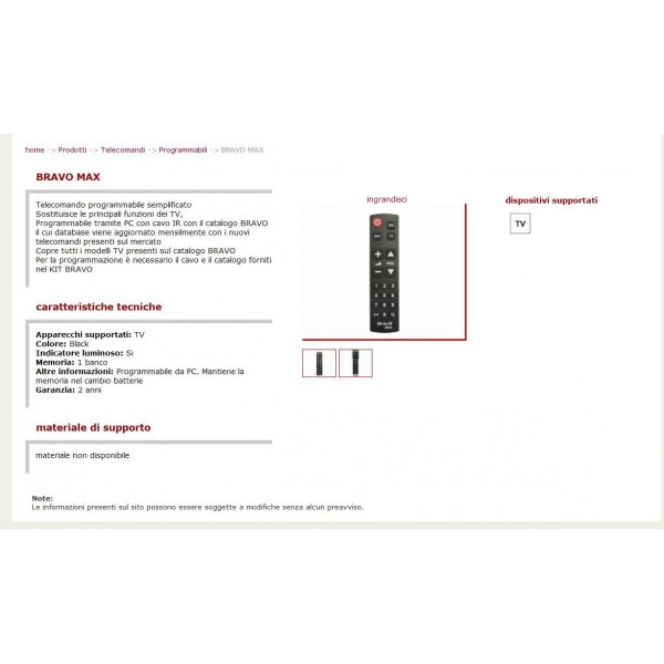 Programmabile tramite PC con cavo IR con il catalogo BRAVO il cui database viene aggiornato mensilmente con i nuovi telecomandi presenti sul mercato