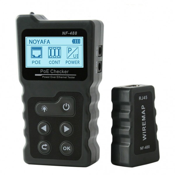 Tester POE con display LCD. Mostra le informazioni sullo standard POE, come lo standard af/at, il voltaggio di alimentazione, la polarità dell’alimentazione, i pin dei dispositivi POE non standard. Verifica i cortocircuiti, i circuiti aperti e incrociati nei cavi di rete tramite il ricevitore remoto. Con display LCD 128x64 mm retroilluminato. Verifica i cavi Cat 5e, 6, schermati e non schermati UTP. Lunghezza massima cavo 600 mt. Si usa con emettitore+dispositivo remoto o emettitore+switch/router. Gamma di voltaggio: DC0-60V POE switch Gamma di potenza: 0-18W Gamma di corrente: 0-3 A Gamma di test potenza: 0-180W Standard identificati: 802.3af/at ( standard/non-standard) Protezione voltaggio input: DC48V 5mA Corrente massima operativa: .80mA Loopback: compatibile con switch 10M, 100M, 1000M Alimentazione: 3 batterie AAA