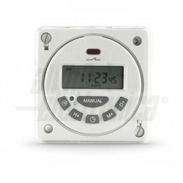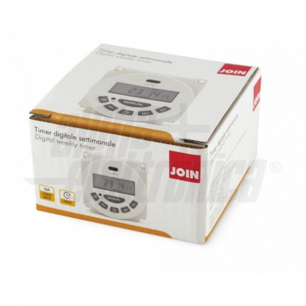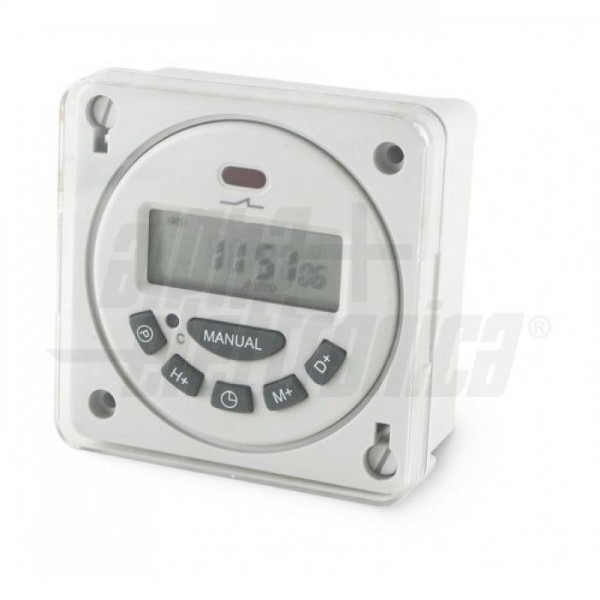 Timer digitale che permette di programmare l'accensione all'orario desiderato di apparecchi elettrici ad esso collegati come lampade ed elettrodomestici.