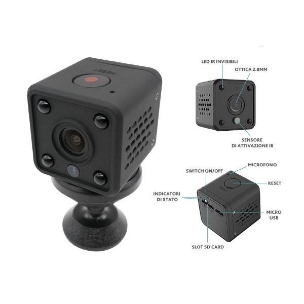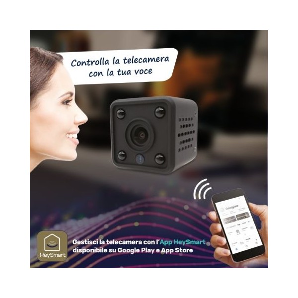 Dotata di batteria interna di backup ricaricabile con autonomia fino a 3 ore. La telecamera è dotata di 4 IR LED invisibili per visione notturna e di un microfono. Registra audio e video su micro SD (max 64GB - non inclusa) ed invia notifiche push in caso di rilevamento movimento. Supporta il protocollo ONVIF. Controllabile tramite Smartphone, con l'App HeySmart, disponibile per Android e iOS. Compatibile con Amazon alexa e Google assistant.